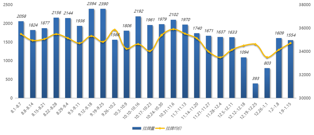 2022-2023年(nián)南(nán)京二手住宅周新增挂牌量價情況