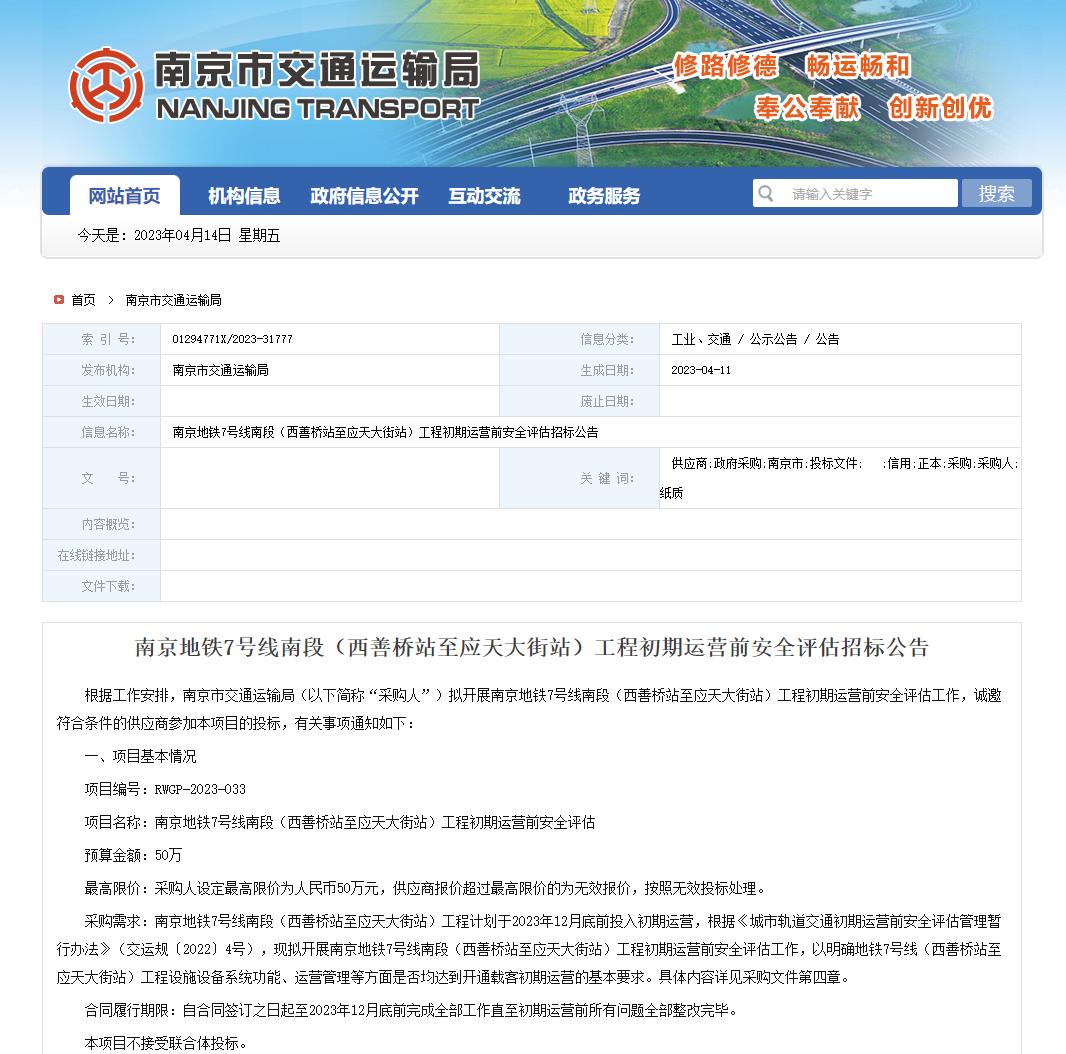 根據此次公告,7号線南(nán)₩<←段(西(xī)善橋站(zhàn)至應天大(dà)街(jiē)站(zhàn))工≈±ε(gōng)程計(jì)劃于今年(nián)12月(yuè)底前投入初期→♦€運營。根據《城(chéng)市(shì)軌道(dào)交通(tōng)₩σ®初期運營前安全評估管理(lǐ)暫行(xíng)辦法》(交運規〔20↔±≤22〕4号),南(nán)京市(shì)交通(tōng)運輸局拟開(kāi)展南±∞₽(nán)京地(dì)鐵(tiě)7号線南(nán)÷γ'ε段(西(xī)善橋站(zhàn)至應天大(dà)街(jiē)站(zhàn))工(€©gōng)程初期運營前安全評估工(gōng)作(zuò),以明(míng)确該段 •工(gōng)程設施設備系統功能(néng)、運營管理(lǐ)等方面是(shì)否均達到(d¥§ ào)開(kāi)通(tōng)載客初期運營的(de)基本要↓©∑(yào)求。