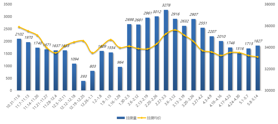 2022-2023年(nián)南(nán)京二手住宅 λ周新增挂牌量價情況