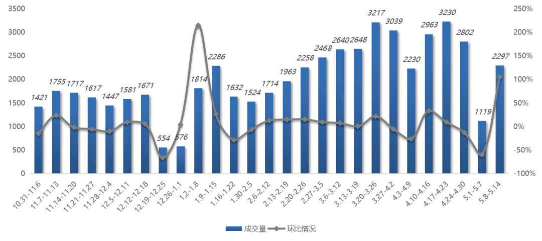 1、成交量2297套,環比有(yǒu)所上(shàng)漲