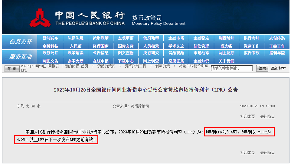 2023年(nián)10月(yuè)20日(rì),央行(xíng)發布2023年(nián)10月(yuè)20日(rì)全國(guó±↑)銀(yín)行(xíng)間(jiān)同業(yè)拆借中心受權公布貸款市©€(shì)場(chǎng)報(bào)價利率(LPR)公告。