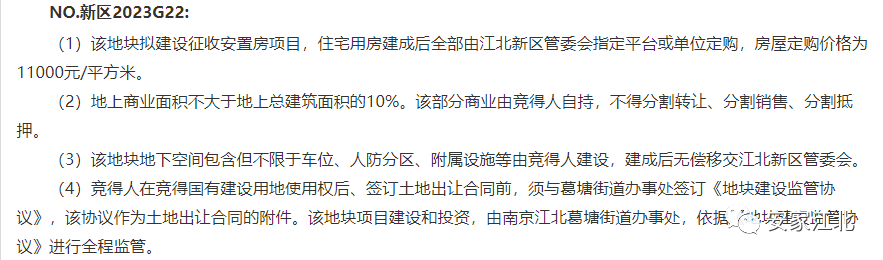 值得(de)注意的(de)是(shì),在地(dì)塊的(de)出讓∏>•條件(jiàn)中顯示,該地(dì)塊拟建設征收安置房(fáng)項目,住宅用(yòng)房(fáng)建↑≠¶≤成後全部由江北(běi)新區(qū)管委會(huì)指定平台或≠☆單位定購(gòu),房(fáng)屋定購(gòu)價格為(wèα'i)11500元/平方米。