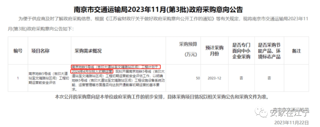 根據南(nán)京交通(tōng)運輸局采購(gòu)意向公告,5号線(吉印大(dà)道(dào)站(zhàn)至文(wén)靖路(lù)站÷★(zhàn)區(qū)間(jiān)),計(jì)劃于2024年(nián)4月(yuσ≈σè)份投入初期運營。