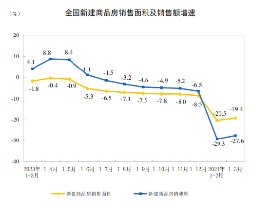 1-3月(yuè)份,全國(guó)新建商品房(fáng)銷售面←®積22668萬方,同比下(xià)降19.4%,其中住宅銷售面積下(xià)降23.4%。新建商品房(fáng)銷售額21355億元,下(xià)降27.6%,其中住宅銷售額下(xià)降30.7%。