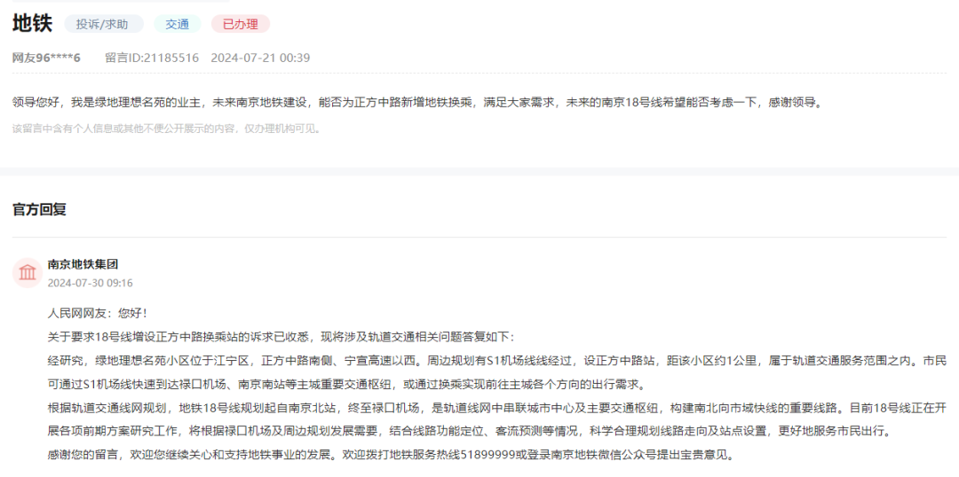 随後官方回複:地(dì)鐵(tiě)18号線規劃起自(zì)南(nán)京北(běi)站(zhàn),終至祿口₽ >↕機(jī)場(chǎng),是(shì)軌道(dào)線網中串聯城(chéng)市(shì)中心及↑©σ主要(yào)交通(tōng)樞紐,構建南(nán)北(běi)向市(shλ•≤ì)域快(kuài)線的(de)重要(yào)線路(lù)。目前18号線正在開✘↑"(kāi)展各項前期方案研究工(gōng)作(zuò)。