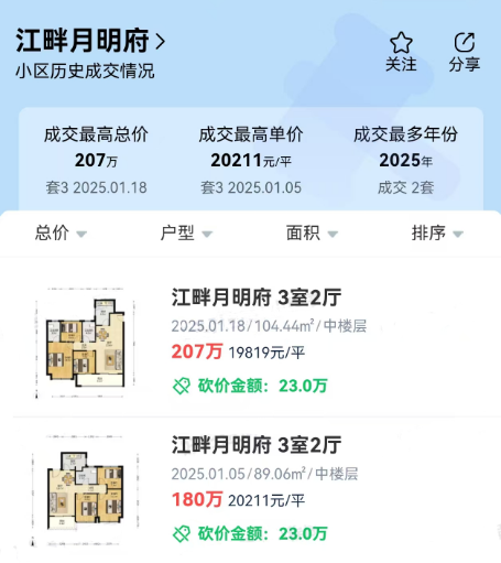 其中一(yī)套建面約89.06㎡房(fáng)源,總價18±0萬,成交單價20211元/㎡;一(yī)套建面約104.44㎡房(fáng)源,總價207萬,成交單價19819元/㎡。