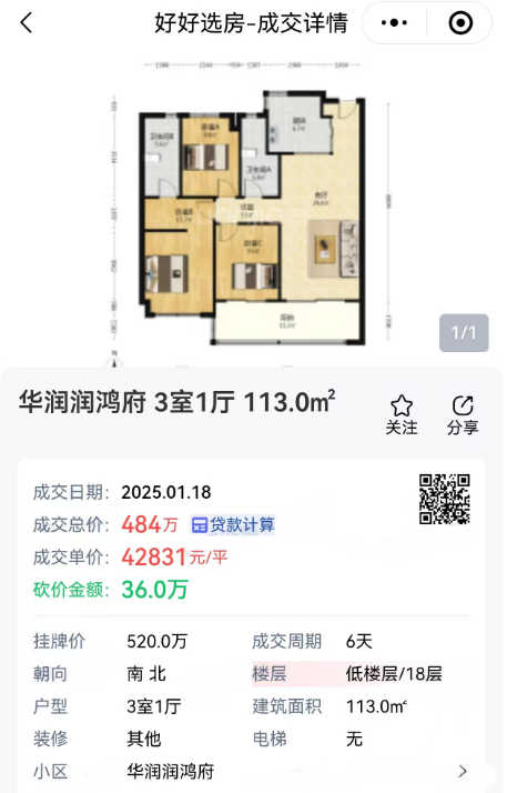 這(zhè)是(shì)一(yī)套3室1廳建面約113㎡房(fáng)源<,房(fáng)主挂牌520萬,最終降價36萬,成交總價484萬,成交單價約42831元/㎡。從(cóng)成交周期來(lái)看(kàn),僅有(y∑↑ǒu)6天,堪稱“神速”!