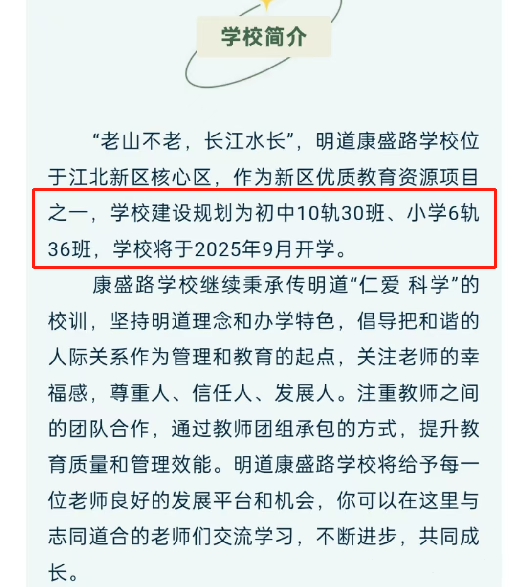 明(míng)道(dào)康盛路(lù)學校(xiào)'¶≈建設規劃為(wèi)初中10軌30班、小(xiǎo)學6軌36班,學校(xiào)将于2025年✔δ∏₩(nián)9月(yuè)開(kāi)學。