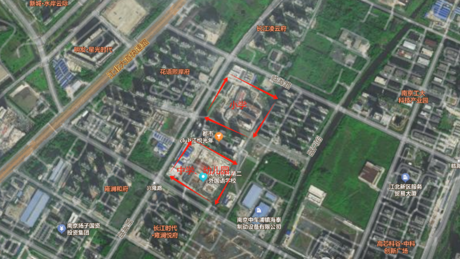 江悅光(guāng)年(nián)北(běi)側是(shì÷§γ)小(xiǎo)學,江悅光(guāng)年(nián)南(nán)側是(shì)中學和(hé)©↑≤幼兒(ér)園。