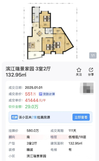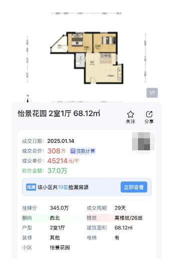 怡景花(huā)園一(yī)套2室1廳建面約68.12㎡房(fáng)源,成交總價308萬元,成交單價僅45214元/㎡。房(fáng)主報(bào)價345萬,最終降價37萬元成交,房(fá±€₩≥ng)源挂牌周期僅29天。