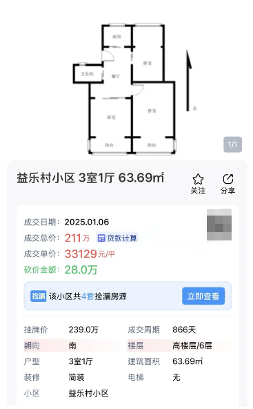 擁有(yǒu)“火(huǒ)瓦巷小(xiǎo)學+鐘(zhōng)英中學”的(de)益樂(yuè)村(cūn)小(xiǎo)區(qū)成交了(le)一(yī)套建面約63.69㎡三室一(y π ī)廳房(fáng)源,總價211萬,單價僅33129元/平。