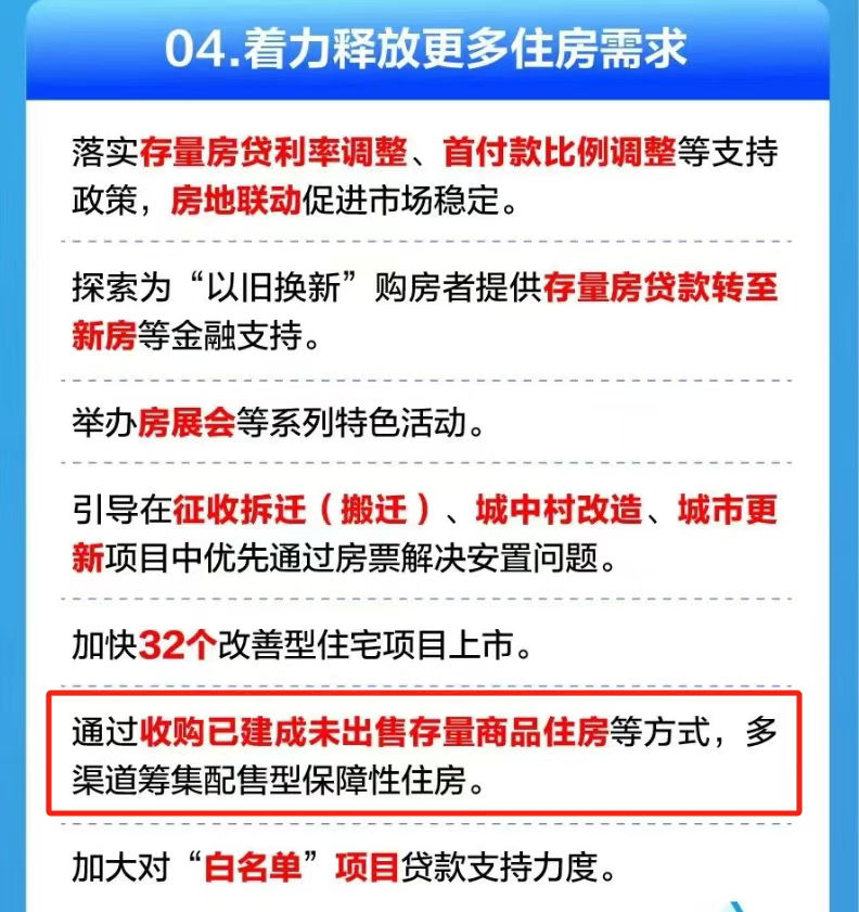 事(shì)實上(shàng),早在2024年(nián)9月(yuè)29日(•φ≥€rì),南(nán)京發布的(de)30條新政,就(jiù)專門(mén)提及:通(tōng)過收購(gòu)已經建成未出售的(de)存量♠↔☆商品住房(fáng),多(duō)渠道(dào)籌集配售型保障性住房(fáng)。