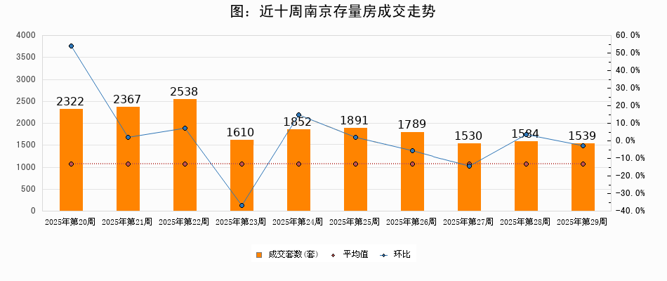 存量房(fáng)方面,第29周南(nán)京存量房(fáng)成交1539套,較上(sh ×àng)周減少(shǎo)45套,環比下(xià)降2.8%。從(cóng)>α♠近(jìn)十周成交走勢來(lái)看(kàn),周均成交套數(£×£shù)為(wèi)1902套,本周低(dī)于平均水(sh₽§$×uǐ)平19.1%。