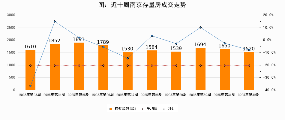存量房(fáng)方面,第32周南(nán)京存量房(fáng)成交1520套,較上(shàn∏$'g)周減少(shǎo)130套,環比下(xià)降7.9%。從(c₩∑εβóng)近(jìn)十周成交走勢來(lái)看(kàn),"↑周均成交套數(shù)為(wèi)1665套,本周低(dī)于平均水(shu÷ελǐ)平8.7%。