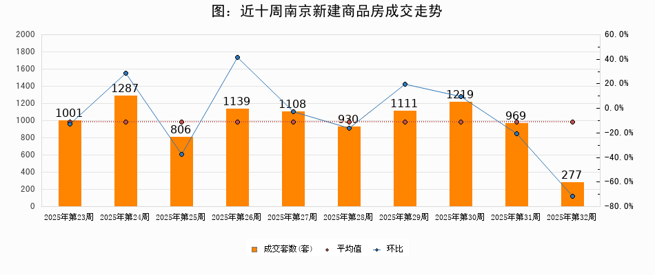 進入2025年(nián)第32周(08月(yuè)04日(rì)-08₹&月(yuè)10日(rì)),南(nán)京新建商品房(fáng)成交277套,較上(s→πhàng)周減少(shǎo)692套,環比下(xià)降71.4%。從(cóng)近(™δjìn)十周成交來(lái)看(kàn),周均成交套數(shù)為(wèi)984↑×∑•套,本周成交277套,低(dī)于近(jìn)十周平均成交量71.8%。