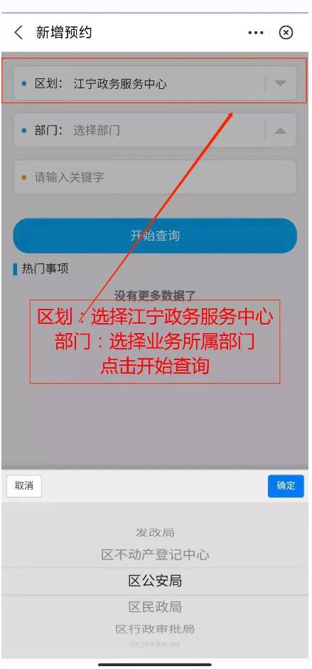 第六步:區(qū)劃選擇“江甯政務服務中心”;部門(m≠→&én)選擇業(yè)務所屬部門(mén);點擊“開(k₹āi)始查詢”