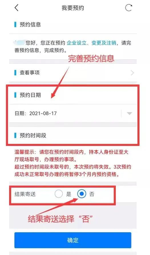 第八步:選擇預約日(rì)期和(hé)預約時(shí)間(jiān)段,“♥>↔結果寄送”填“否”,點擊“确定”進行(xíng)預約,成功後自(zìπ★)動跳(tiào)轉至“我的(de)預約”界面。