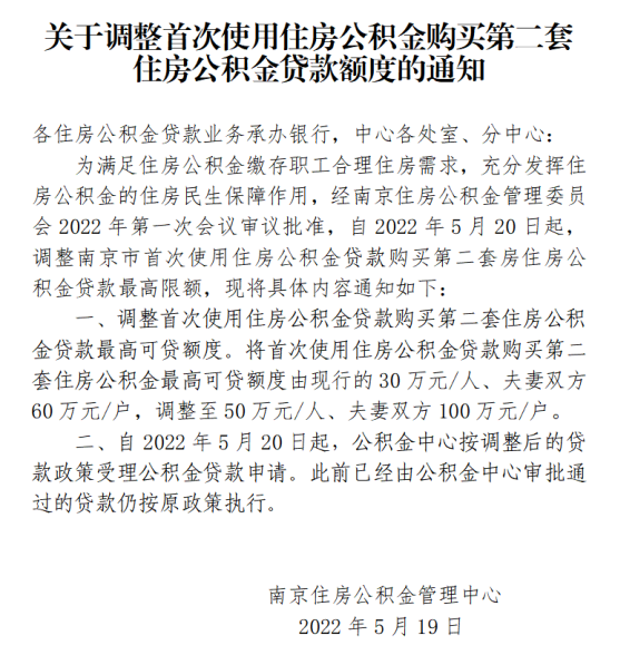 南(nán)京住房(fáng)公積金(jīn)管理(lǐ)中心發布,調整首次使用(yòng)住房(fáng)公積金(jīn)貸款購(gòuσ↕)買第二套住房(fáng)公積金(jīn)貸款最高(gāo)可™★(kě)貸額度。